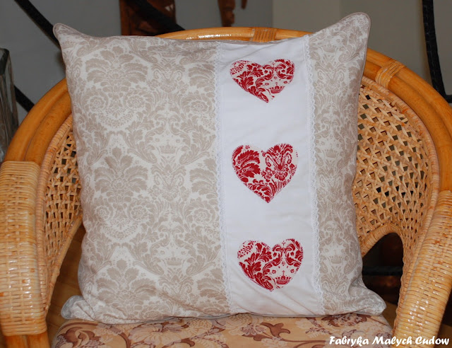 Poduszka ozdobiona wypustką, koronką i aplikacjami w serca.